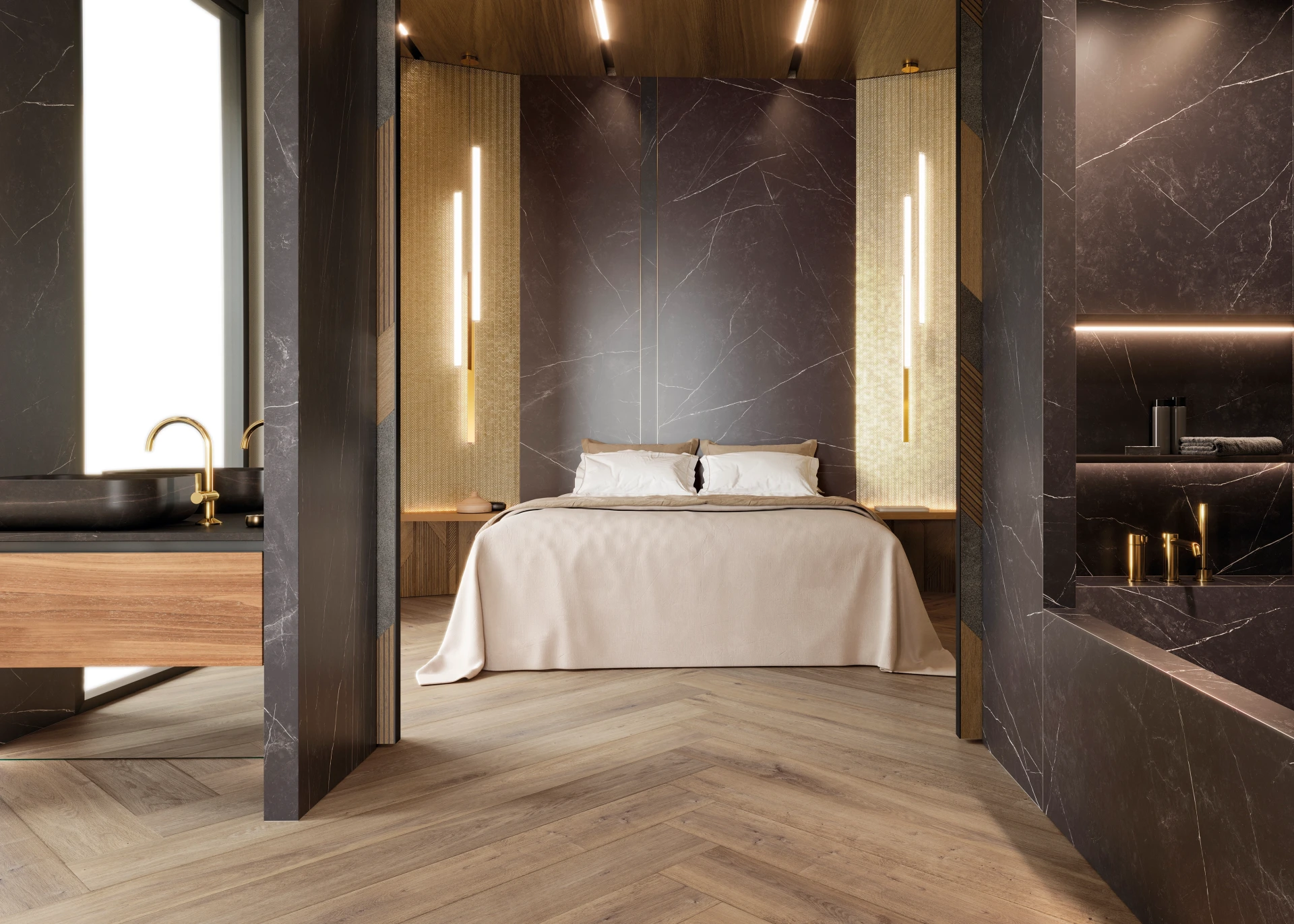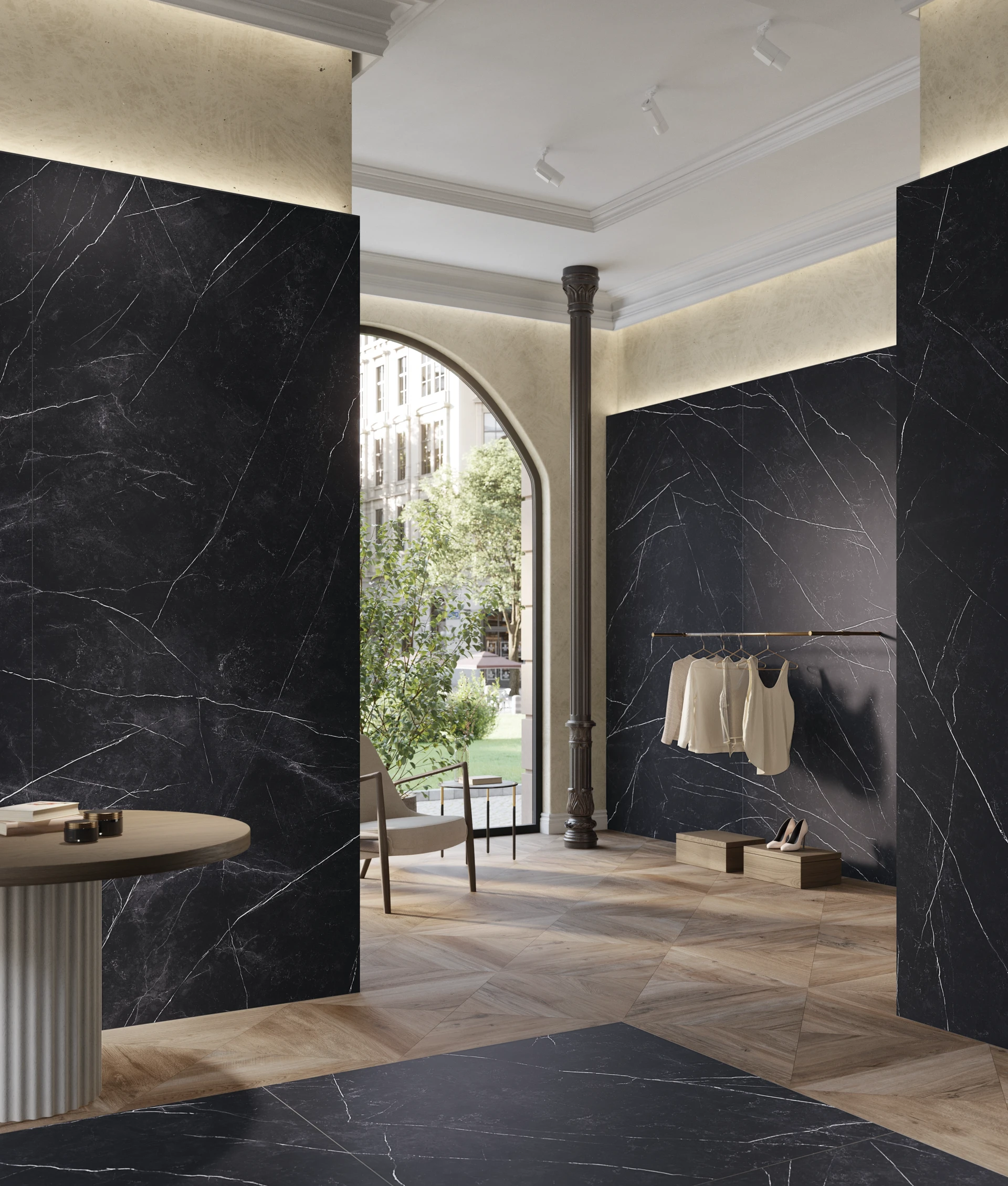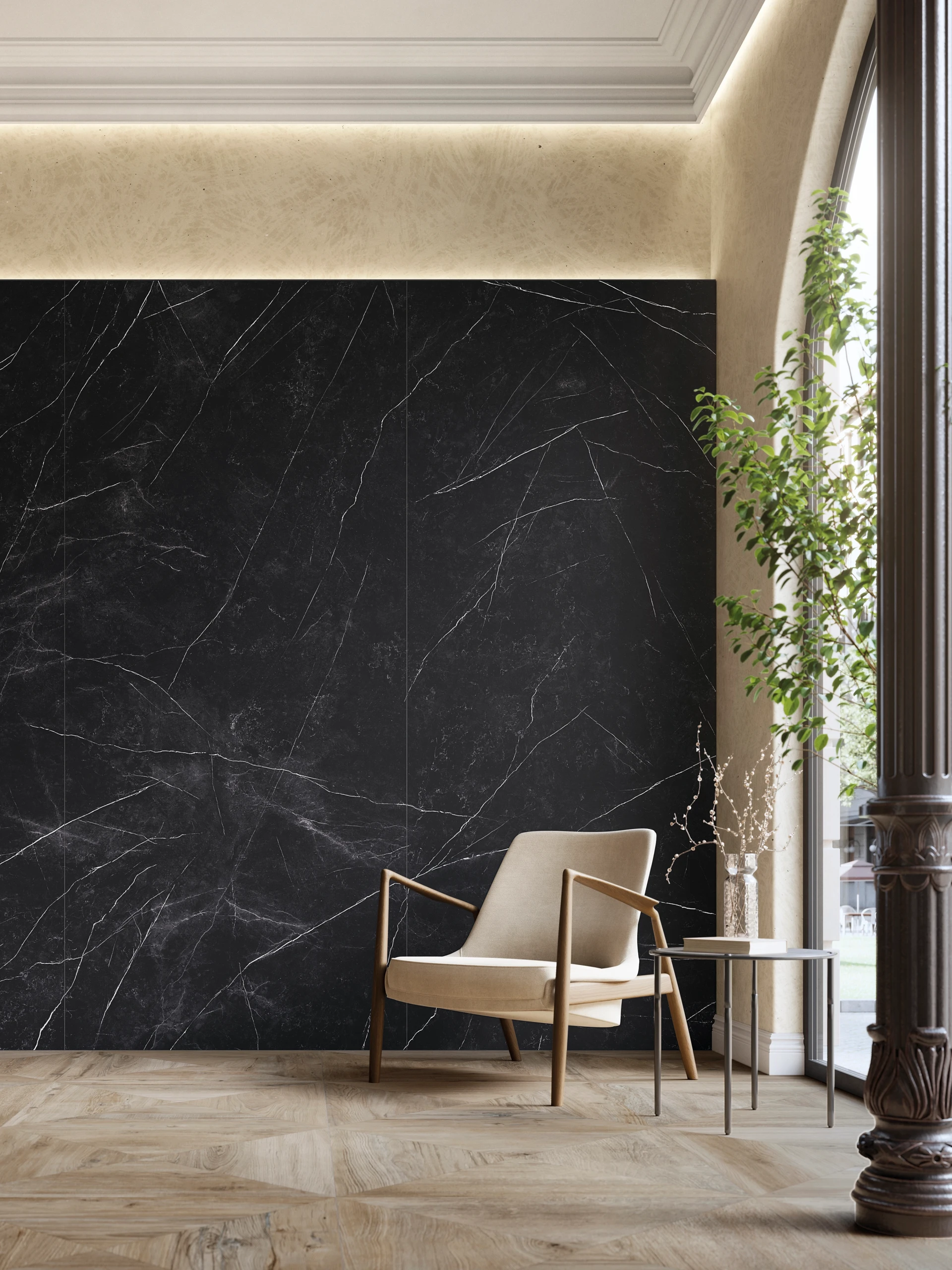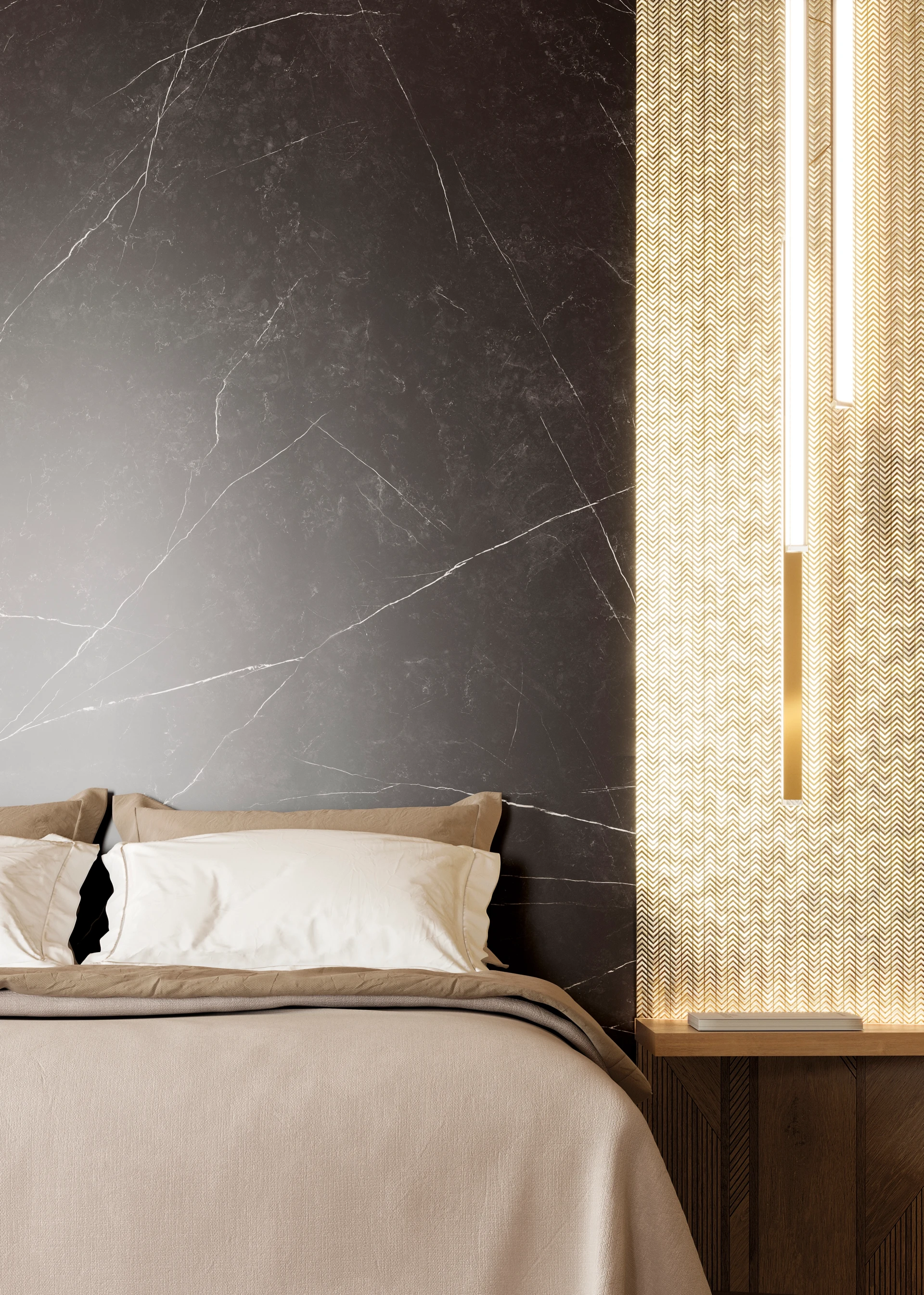 Wyrafinowany marmur, na którym skrzyżowanie świetlistych żył rozchodzących się na powierzchni tworzy subtelną grę kontrastów, tworząc niepowtarzalny design.