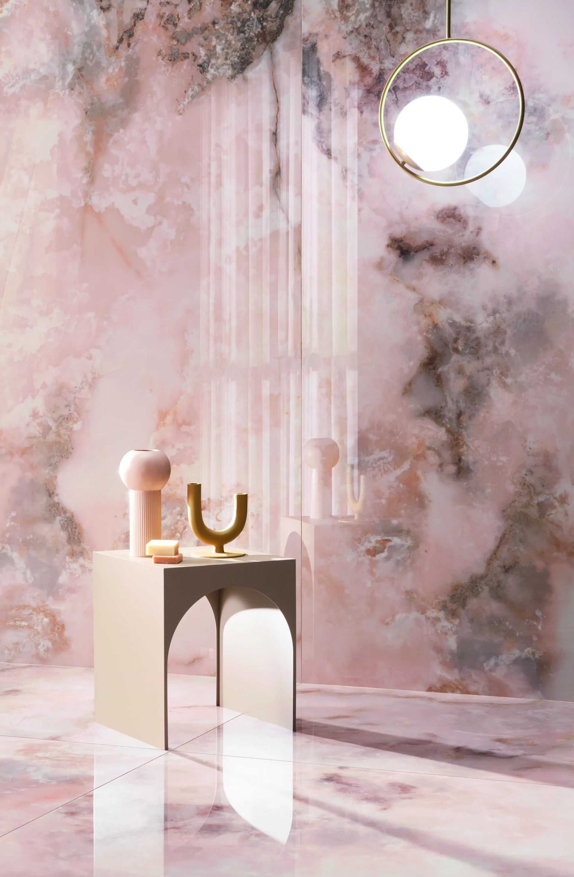 Charakterystyczną dla minerału przestrzenność i świetlistość Tubądzin uchwycił dzięki pokryciu ceramiki niesłychanie szklistą granillą. Wnętrza urządzone w kolekcji Onice, podobnie jak sam onyks, są skąpane w świetle i emanują jego siłą.