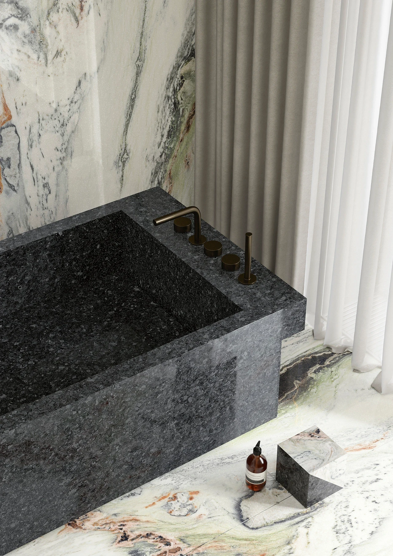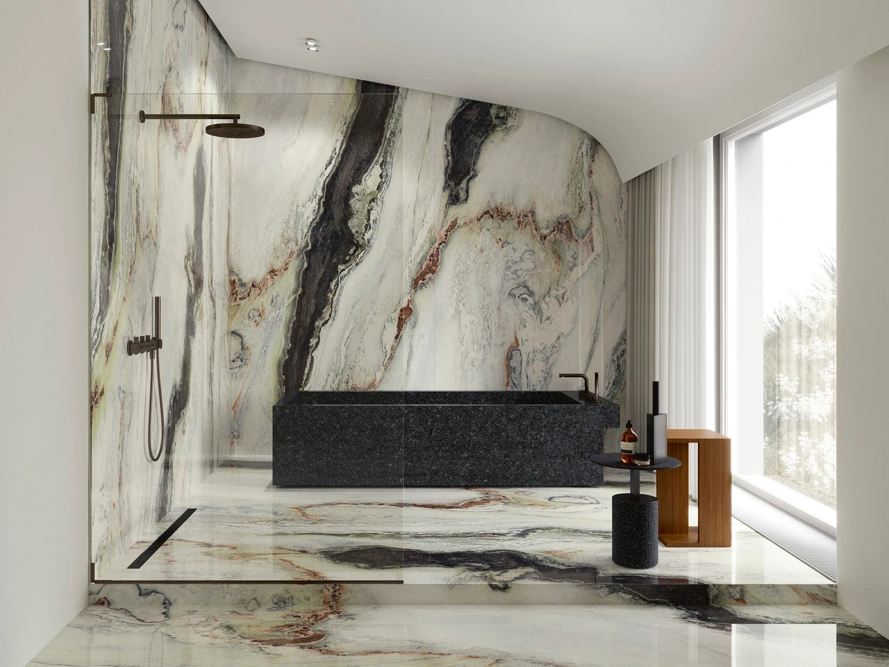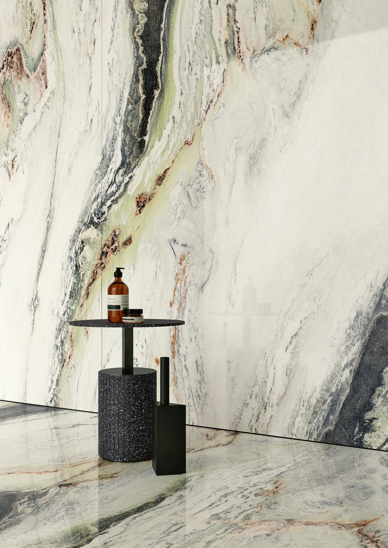 Panda White z kolekcji Ultra Marmi to duże czarne cienie, które wyróżniają się na jasnym białym tle, a dodatkowo są wzbogacone falistymi żyłkami w odcieniach szarości, zieleni i bursztynu. Chromatyczną grę Panda White podkreśla nowa powierzchnia GLINT, niespotykany dotąd efekt, który nadaje powierzchni cenne punkty światła.
