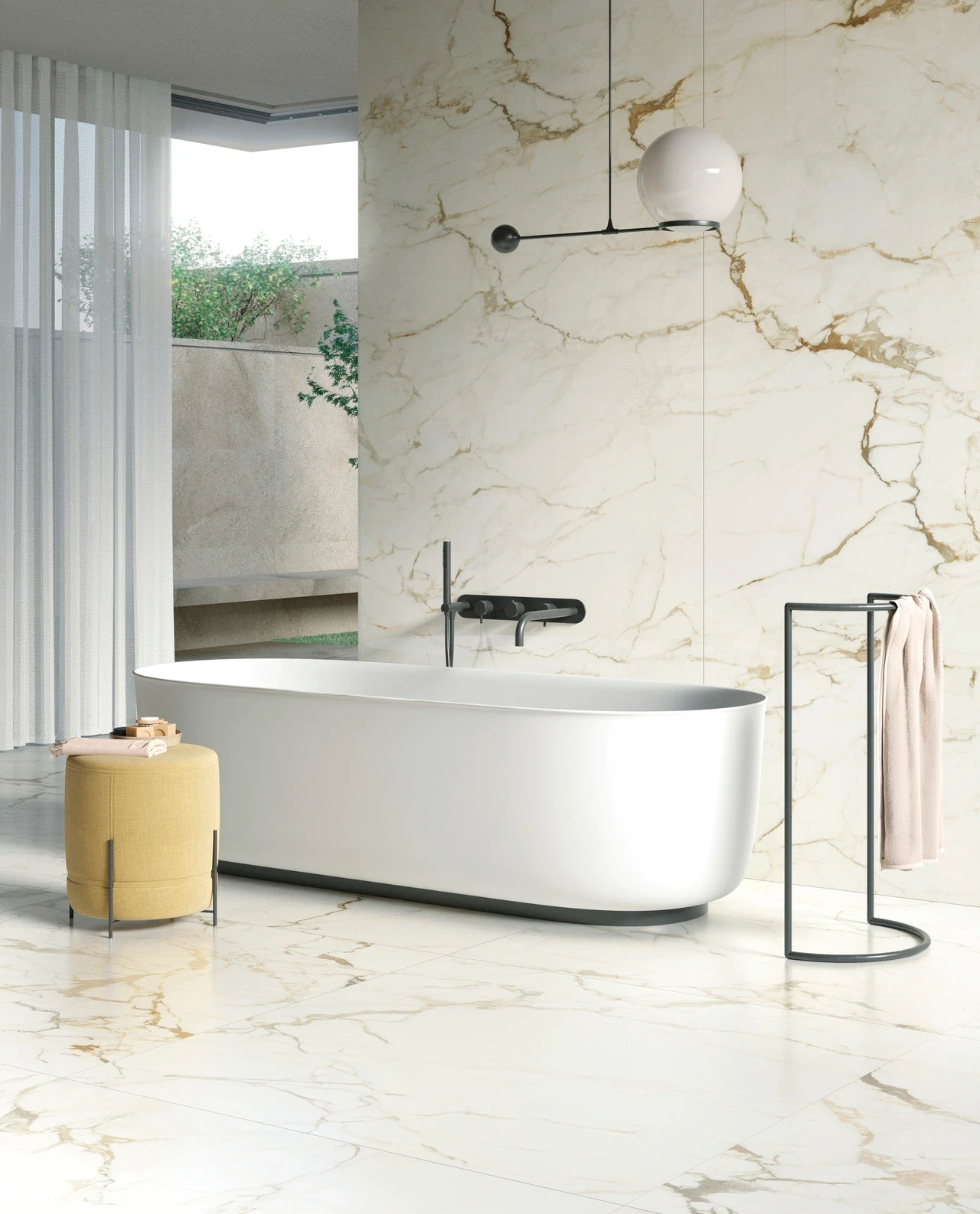 Spiek Calacatta Macchia Vecchia z kolekcji Ultra Marmi przedstawia kremowy motyw imitujący marmur.