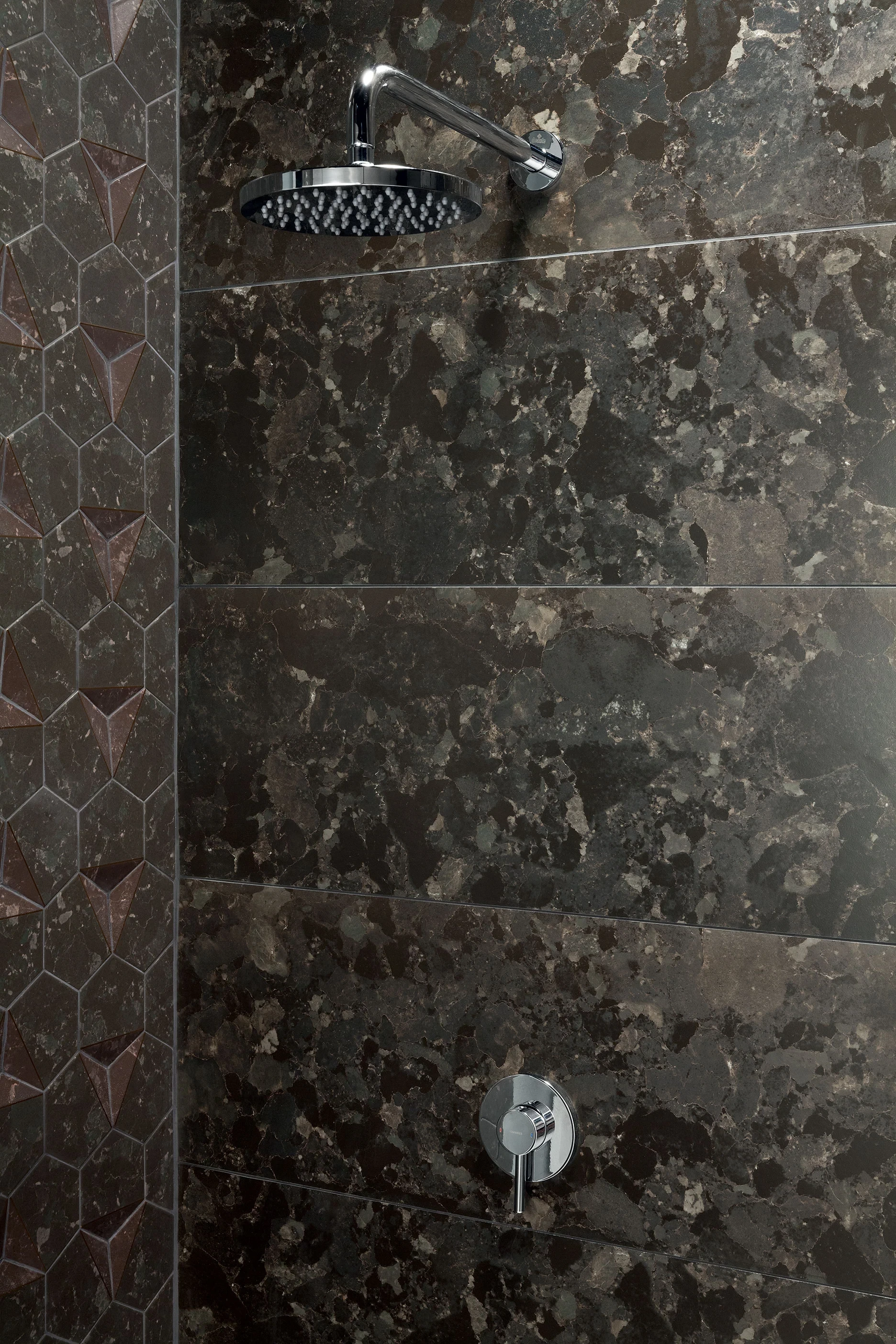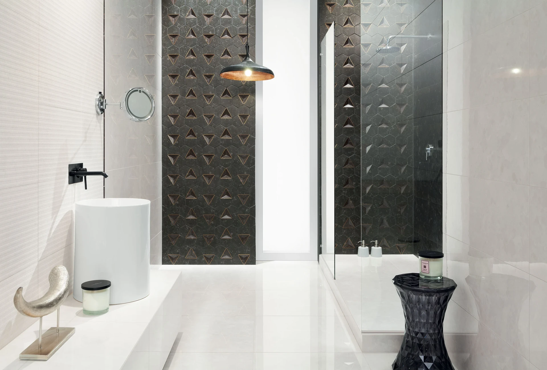 Kontrastowa kolorystyka została uzupełniona modnymi, geometrycznymi zdobieniami i trójwymiarowym tłoczeniem. Podstawę stanowią płytki 32.8 × 89.8 gładkie oraz strukturalne, które możemy zestawiać z mozaiką o kształcie